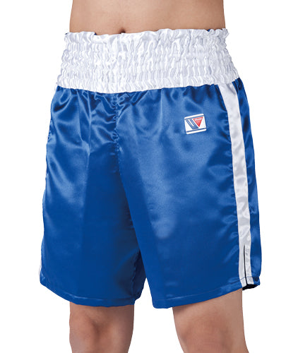 サイド1本ラインの入り、レギュラータイプのボクシングトランクス。カラー:ブルー/ホワイト