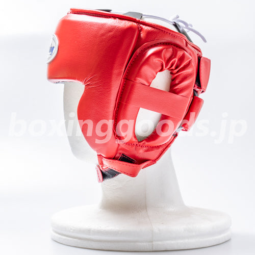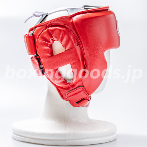 日本ボクシング連盟公認のアマチュア試合用ヘッドギア。アゴベルト、後頭部マジックテープ式。カラー:レッド